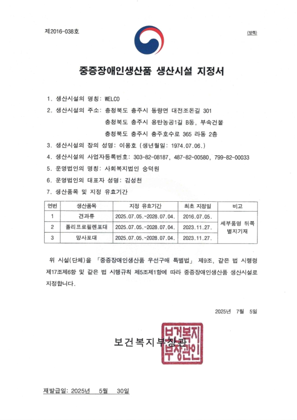보건복지부 지정 중증장애인생산품 생산시설 지정서 게시합니다.